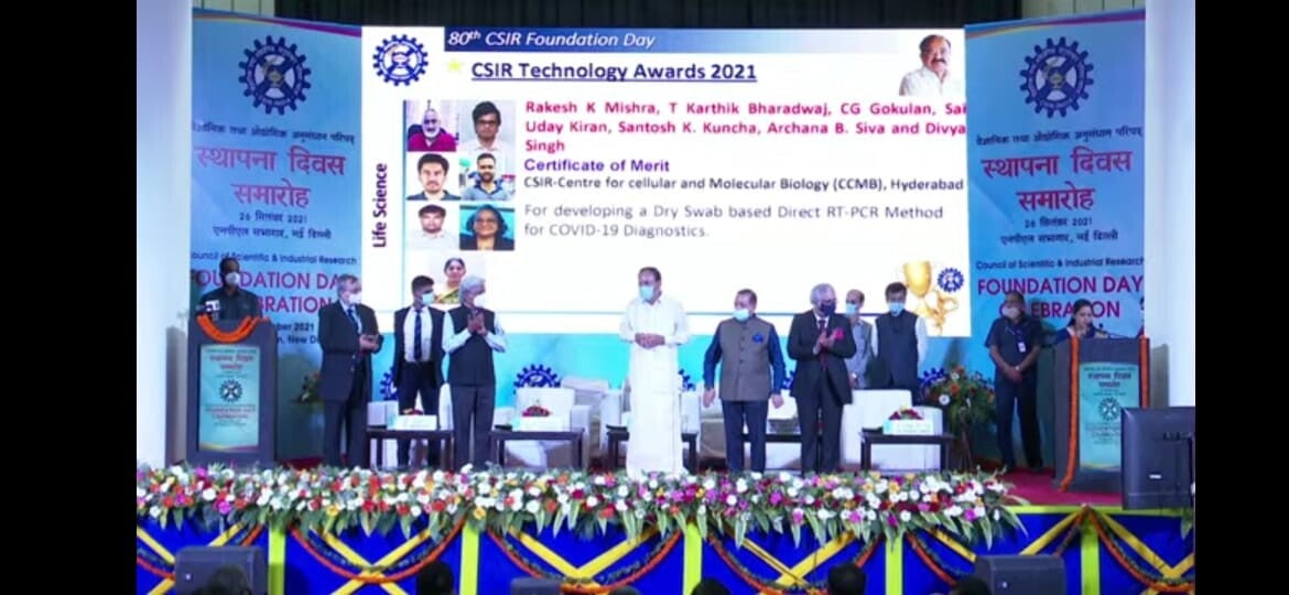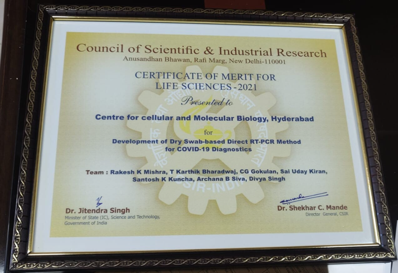 CSIR Technology Award 2021 (Certificate of Merit) for developing a Dry Swab based RT-PCR Method for COVID-19 Diagnostics, in the field of Biological Sciences, CSIR India.